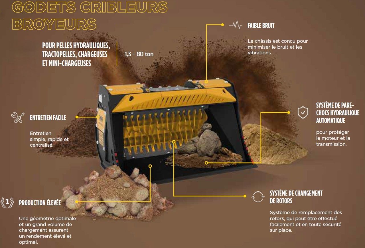 Installés sur les engins de chantier, ils sont idéaux pour trier et cribler les matériaux inertes, avant et après le concassage.