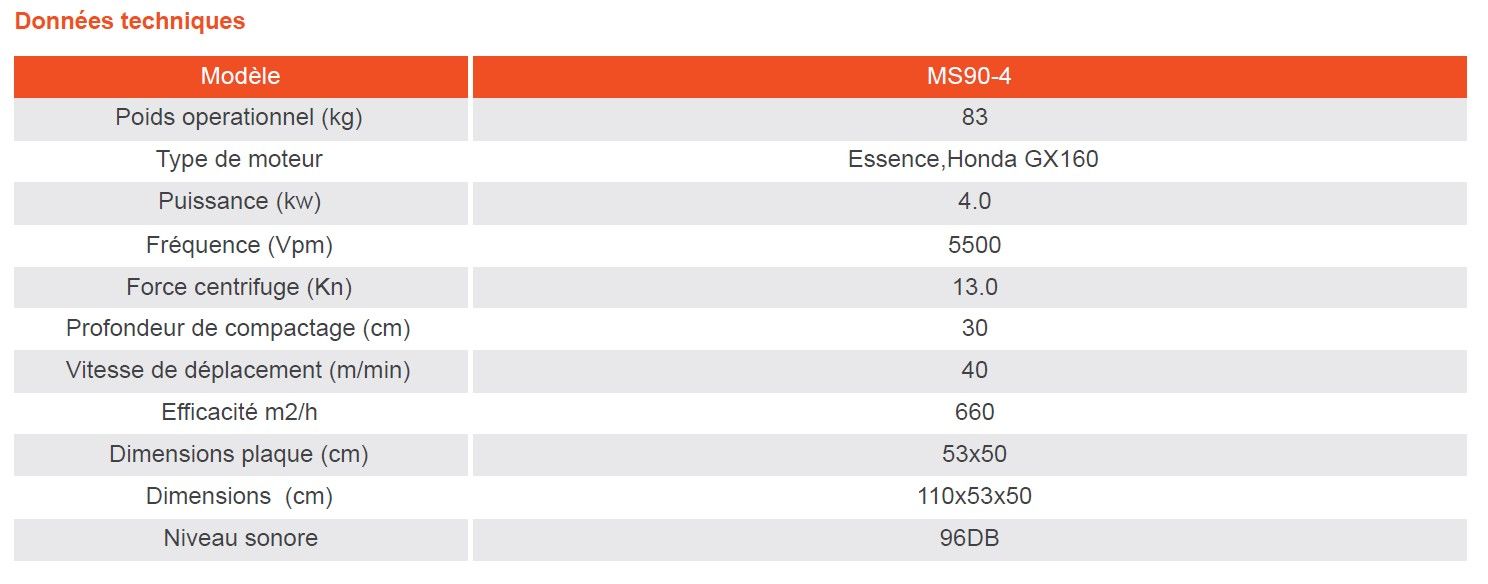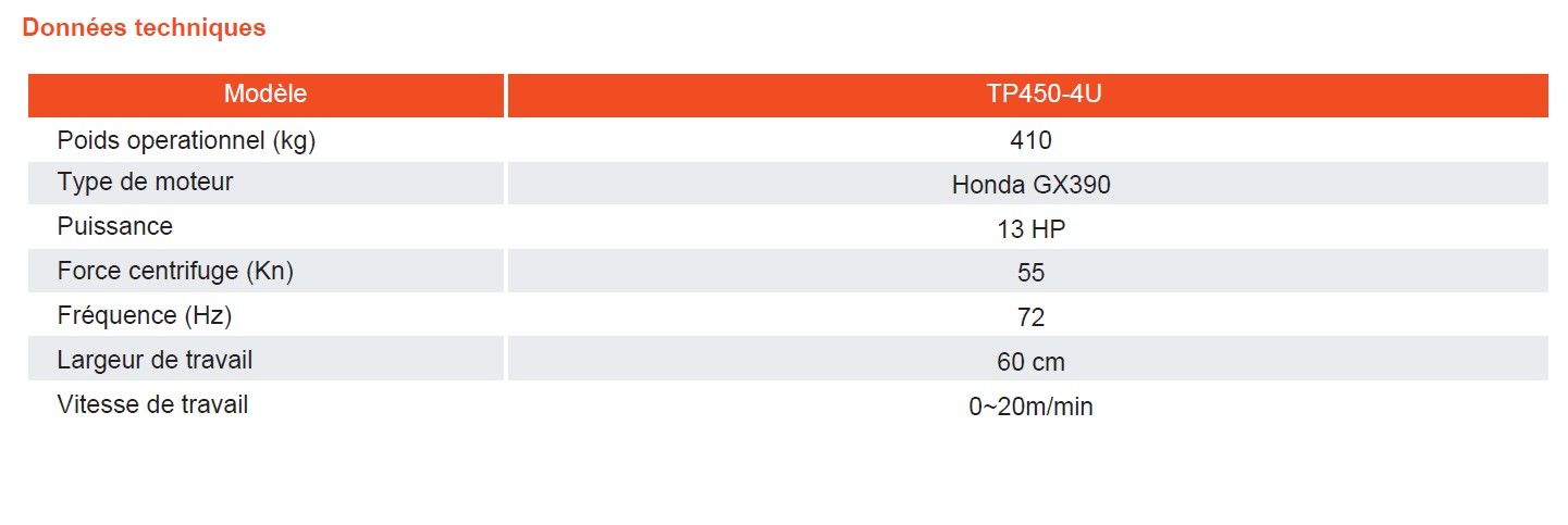 Dotée d'une puissance de 4.0 kW, elle se caractérise par une force centrifuge exceptionnelle de 13.0 kN et une profondeur de compactage remarquable de 30 cm.