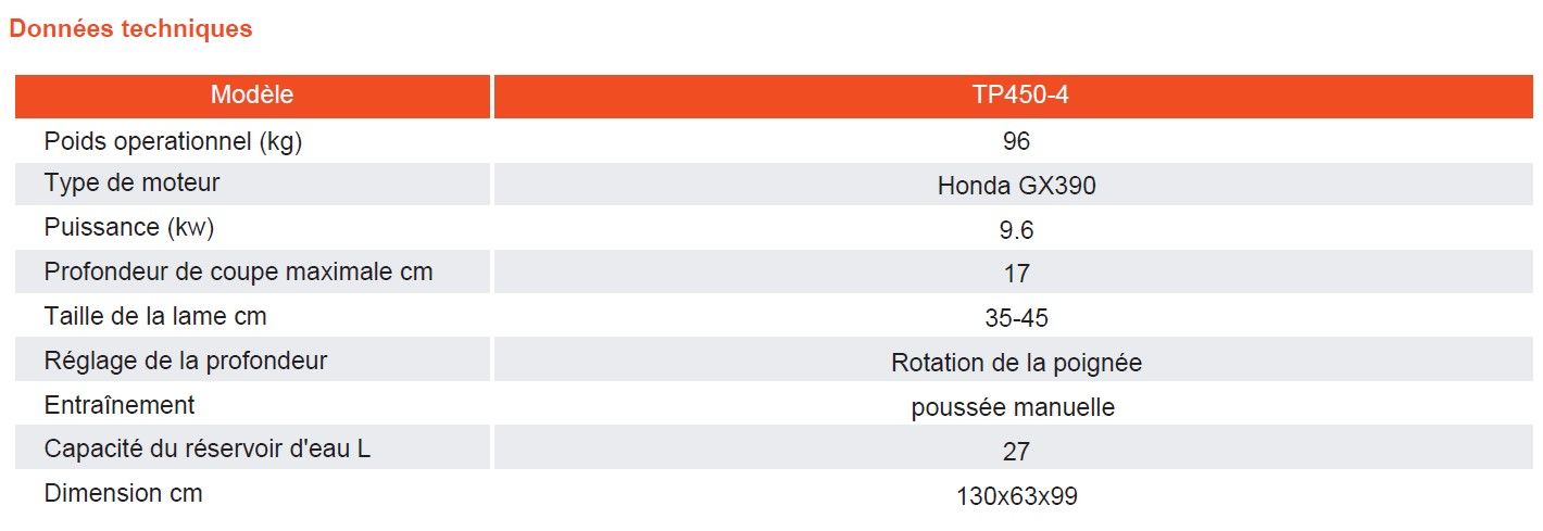 Elle offre une profondeur de coupe maximale de 17 cm, associée à un disque de découpe de 35-45 cm, pour des coupes nettes et précises. De plus, elle est équipée d'un réservoir d'eau d'une capacité de 30 L, assurant un refroidissement efficace du disque de découpe.