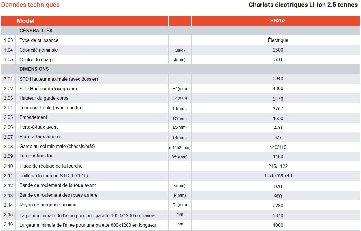 Le modèle FB25 SIGMA est un chariot élévateur électrique au lithium avec une capacité de levage de 2,5 tonnes.