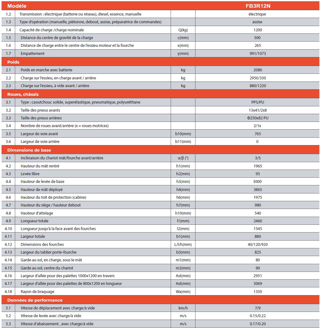 Avec une capacité de levage de 1,2 tonnes, ce chariot se montre aussi polyvalent qu'efficace, répondant à une large gamme de besoins industriels. Fonctionnant à l'électricité, le modèle FB3R12E offre une alternative propre et silencieuse aux chariots élévateurs thermiques traditionnels.